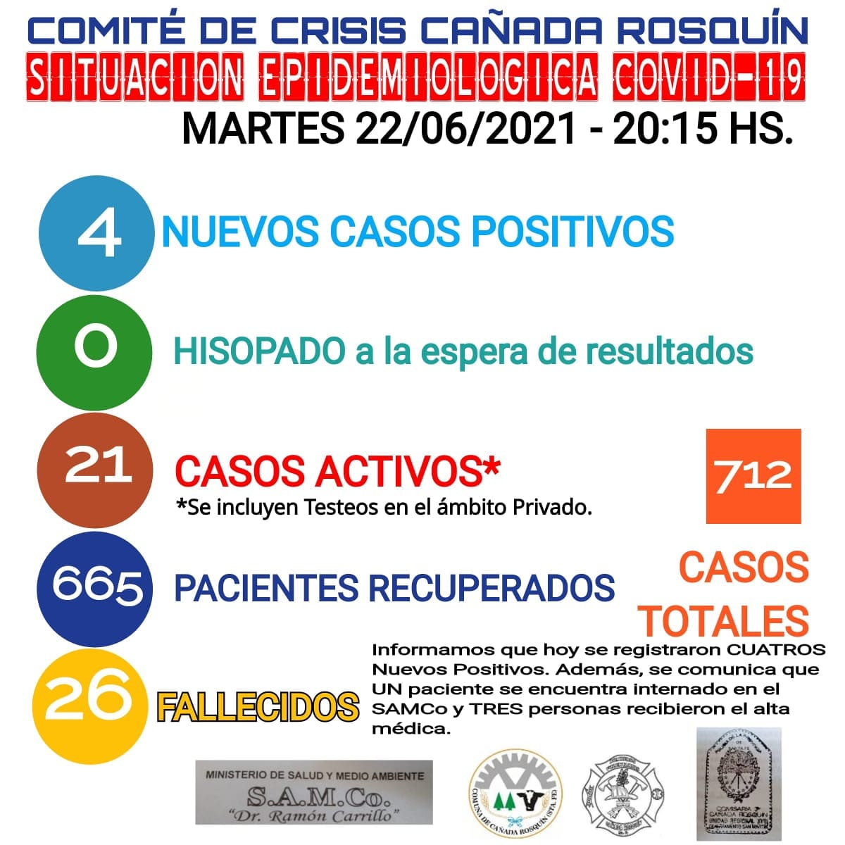 Como dato importante tres rosquinenses recibieron el alta médica y un paciente se encuentra internado en el SAMCo «Ramón Carrillo».-