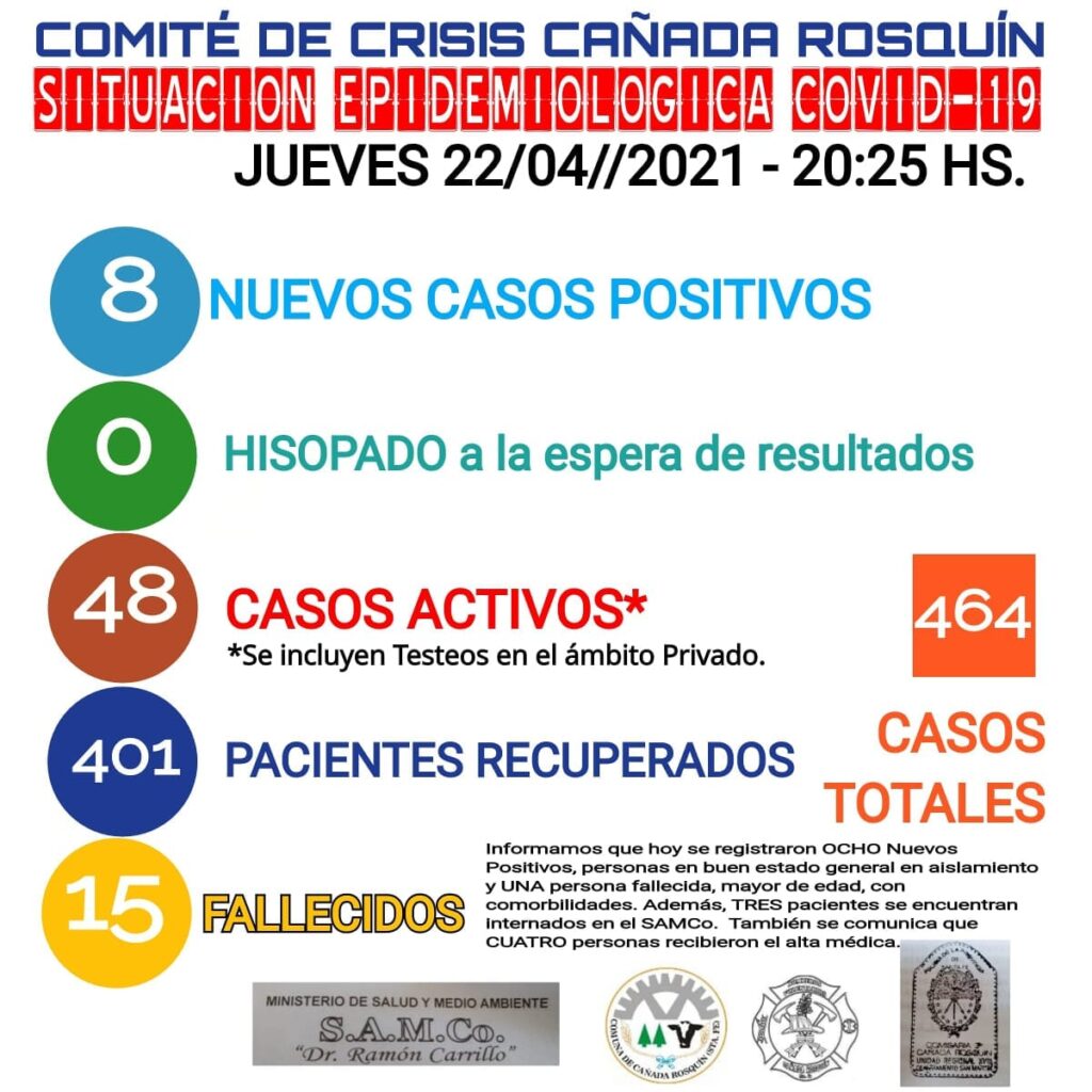 Durante este jueves se informaron ocho nuevos casos positivos de Covid-19 en Cañada Rosquín.-