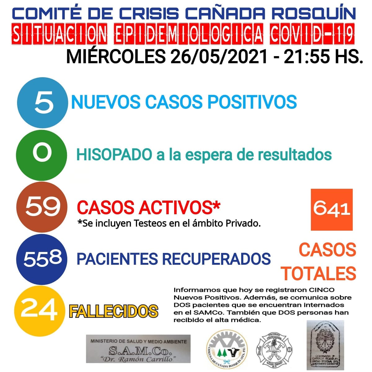 El parte epidemiológico emitido por el Comité de Crisis este miércoles confirmó cinco nuevos positivos detectados en Cañada Rosquín.-
