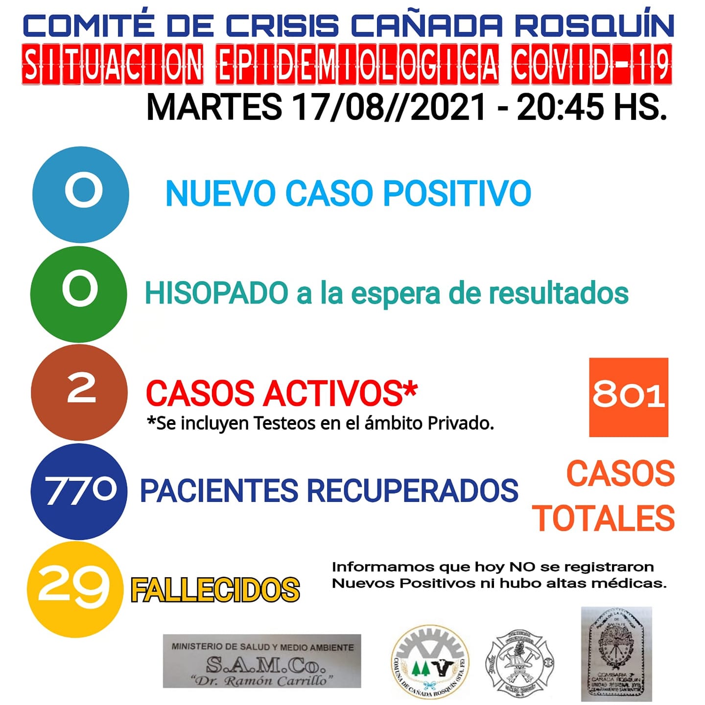 Cañada Rosquín tuvo otro día sin casos positivos de Covid-19, de acuerdo a la información brindada esta noche por el Comité de Crisis en el parte oficial.-