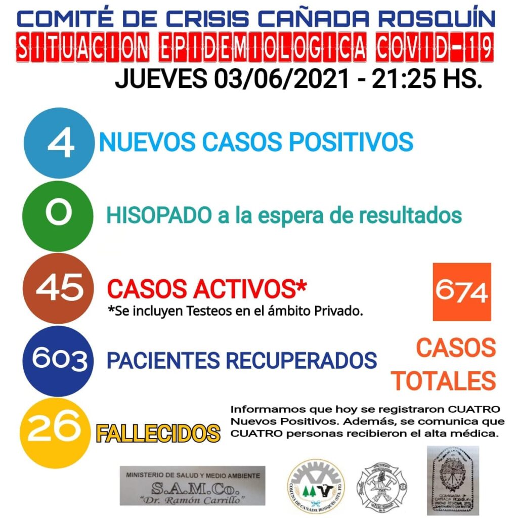 Con las estadísticas actualizadas, Cañada Rosquín quedó con un total de 674 pacientes notificados como positivos desde el inicio de la pandemia, 603 de ellos ya se consideran recuperados.-
