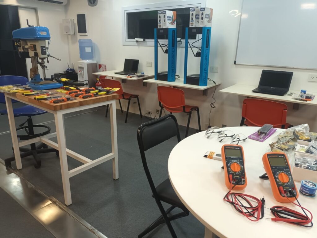 La aula taller consta de 12 puestos de formación, 12 notebooks, impresores 3D, para ir trabajando de manera directa en la ingeniería de precisión. También, tiene equipamiento para electrónica en términos informáticos, vinculada a la programación, montaje, equipo de sonido e imagen, sumado al confort que tiene el aula con aire acondicionado, sector para profesores, cocina y sanitarios.