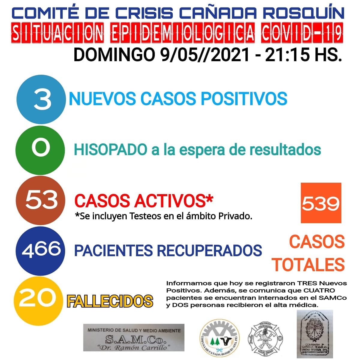 En tanto, se notificó que cuatro pacientes están cursando internación el SAMCo «Ramón Carrillo» de Cañada Rosquín.-
