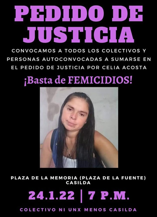 Ante el reciente femicidio de Celia Ester Acosta, joven de nuestra ciudad que actualmente se radicaba en Carcarañá, el Área de la Mujer dependiente de la Secretaría de Desarrollo Social, Deportes y Diversidad manifiesta su enérgico repudio, dolor y espanto ante este nuevo femicidio que se llevó la vida de una joven de 29 años.
