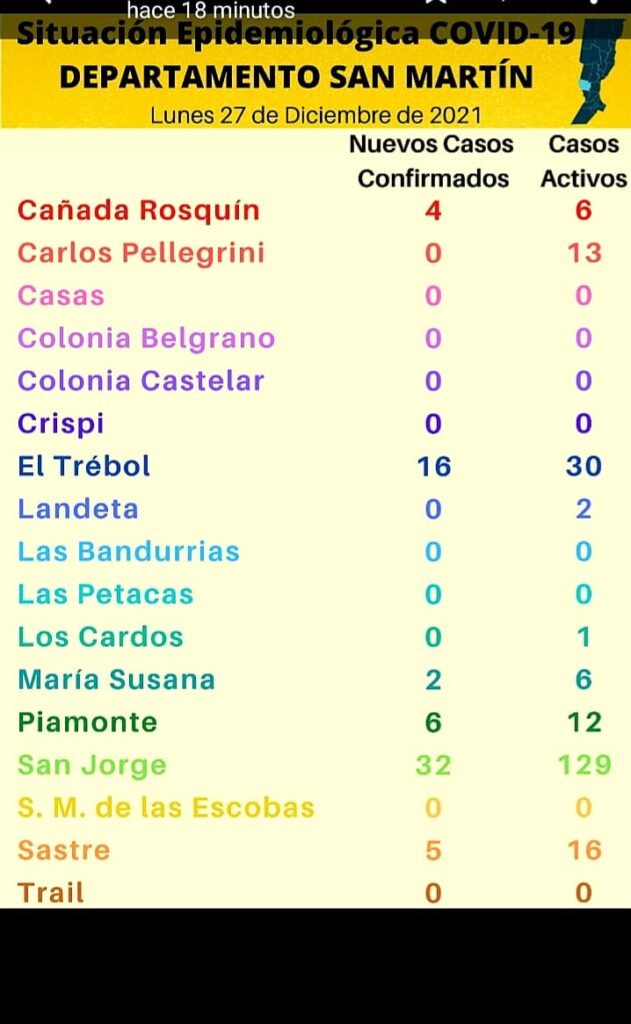 Asimismo El Trébol registró 16 contagios este lunes. Se trata de la cifra récord al menos en los últimos cuatro meses de 2021.