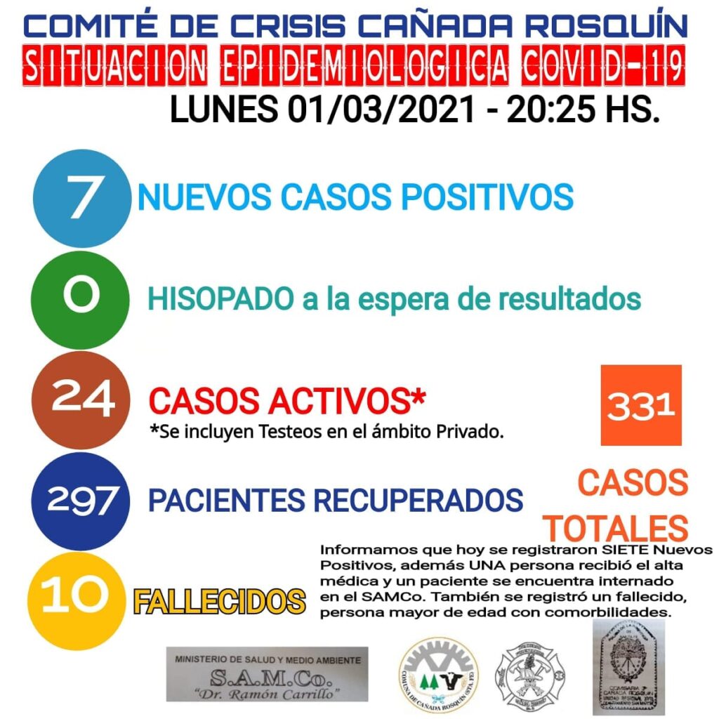 Lamentablemente se notificó una persona fallecida este lunes.- Son 10 los decesos por covid en Cañada Rosquín.-