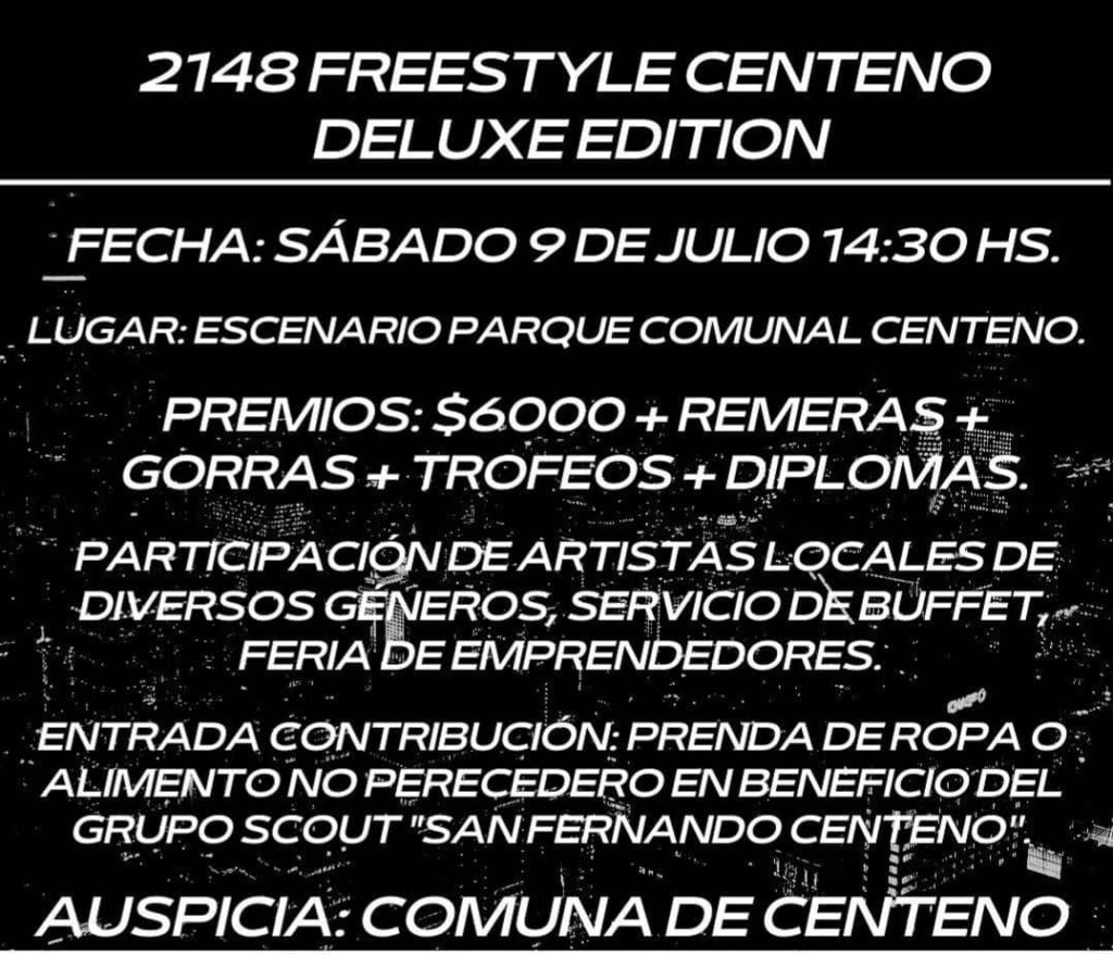 Centeno será sede del encuentro identificado como «2148 Freestyle Centeno», que se desarrollará el sábado 9 de julio a partir de las 14.30 hs en la Plaza del Encuentro de la localidad.