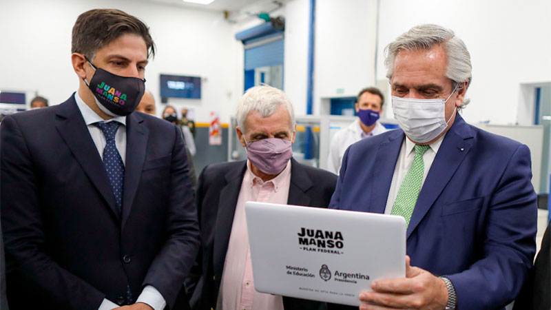 “Ponemos en marcha este plan para llevarle a chicos y chicas el acceso a internet para que puedan conocer, estudiar y conectarse, y lo hacemos produciendo estas computadoras en ocho empresas argentinas que nos van a dar casi 700 mil notebooks al cabo de este año, exactamente el mismo número que se distribuyeron los últimos cuatro años”, afirmó Fernández durante el acto que compartió en la planta de BGH junto al ministro de Educación, Nicolás Trotta; el gobernador de la provincia de Buenos Aires, Axel Kicillof; el intendente local, Alejandro Granados y el director de BGH, Diego Teubal.-