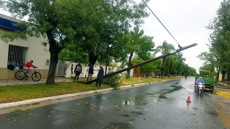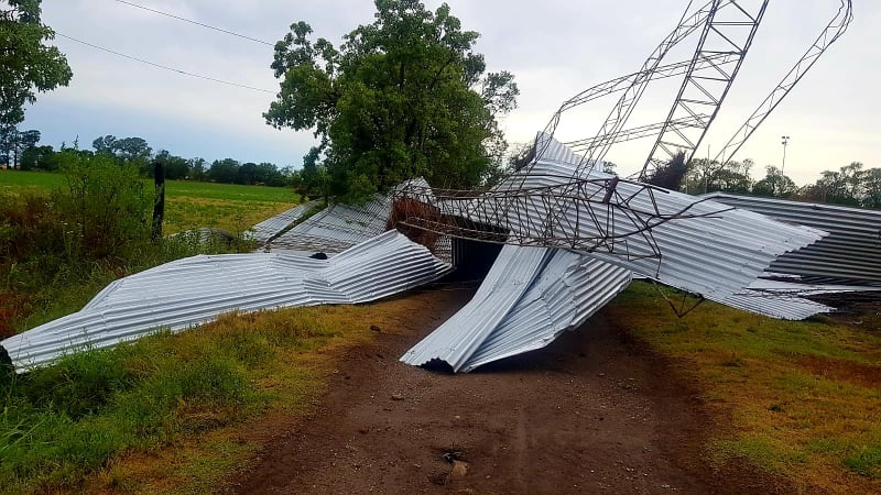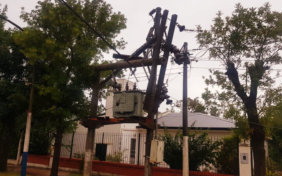 Techo de galpón volado, árboles destrozados, postes de luz venidos abajo y hasta la plataforma de un transformador destruída.