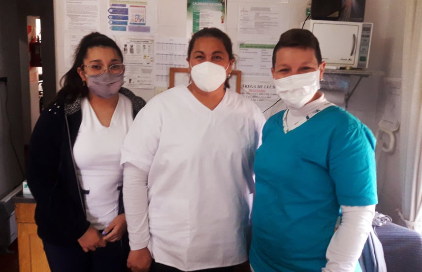 En plena mañana soleada del miércoles se habilitó un operativo dinámico en el Centro vacunatorio con el equipo de Salud local.- La enfermera vacunadora Evangelina Caudana, la Lic. en enfermería Gabriela Aguzzi y la estudiante de enfermería Lucía Nahuelcheo.-