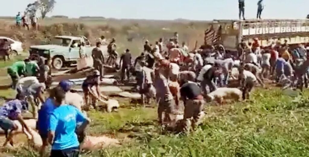 Impresionante saqueo de un camión que volcó con más de 200 cerdos