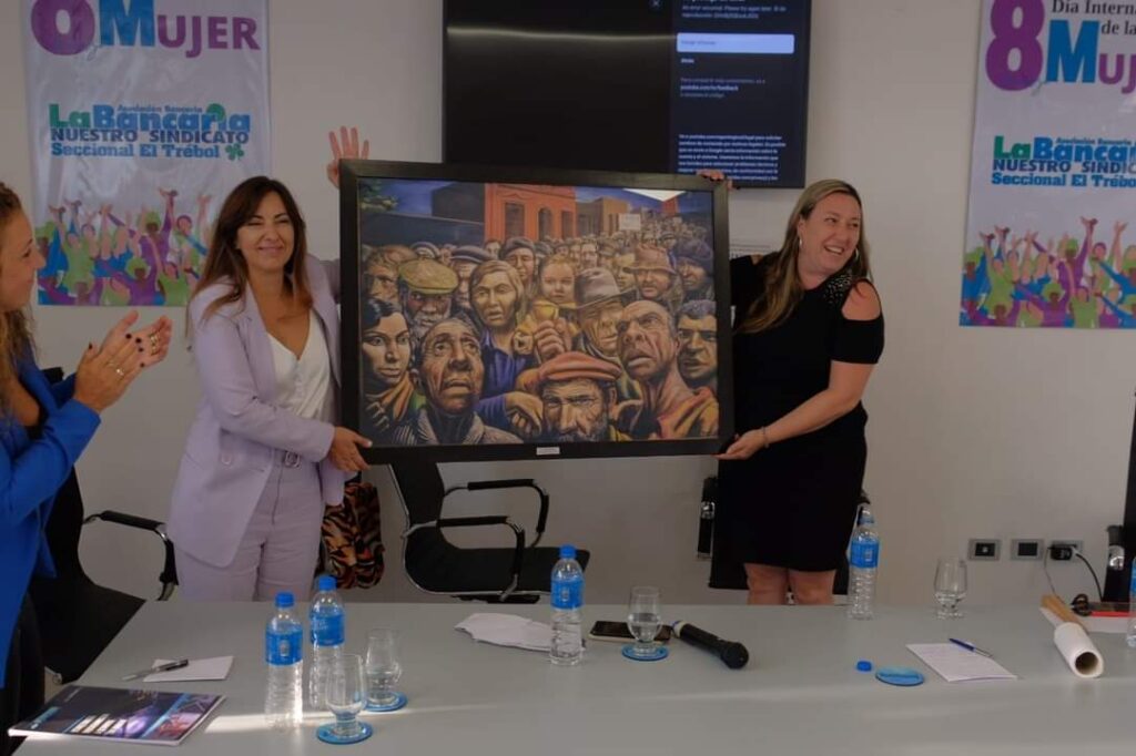 En ese sentido, detallar la singularidad de un momento, cuando se formalizó la entrega por parte de La Bancaria Rosario, a Brenda Contrera, nueva secretaria General de una reproducción de Manifestación, el monumental cuadro pintado en 1934 por el gran artista argentino, Antonio Berni.