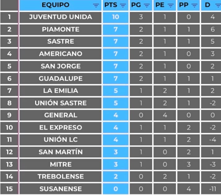 El equipo de Juan Manuel Suligoy llegó a los 10 puntos y logró instalarse en la punta de la tabla de posiciones. Le siguen Piamonte, Sastre, Americano, San Jorge y Americano con 7 puntos.