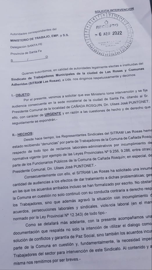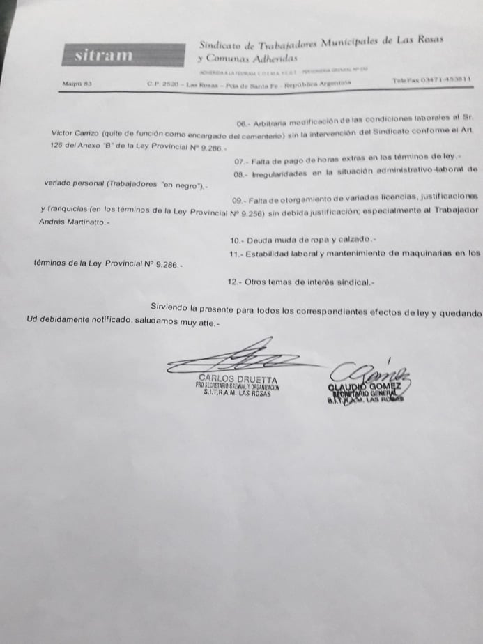 En ese contexto, Claudio Gómez sostuvo: «El dia viernes estuvimos en Cañada Rosquín pero no hablamos con el Presidente Comunal. Cuando retornaba a Las Rosas me llama y dialogamos por telefono. El punto principal le manifesté es que incluya a un trabajador en planta permanente. Después el quite de las conducciones, por las que han rebajado sueldos. También 4 trabajadores del segundo sindicato que afectaron sobre las conducciones. Por eso estamos en unidad con los compañeros del otro sindicato y encaramos esta lucha juntos».