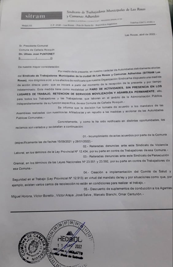 Este lunes Trabajadores Comunales resolvieron por asamblea y desde uno de los gremio que los núclea SITRAM, la realización de un paro total de actividades en Cañada Rosquín.-