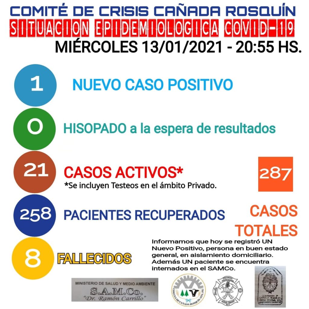 Se notificó este miércoles un nuevo caso positivo de coronavirus.– El Comité de Crisis informó que se elevan a 287 los contagios totales.-