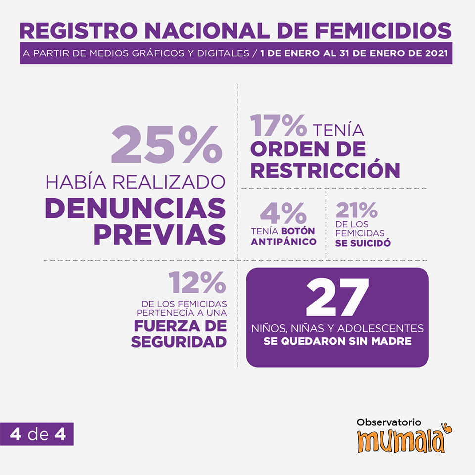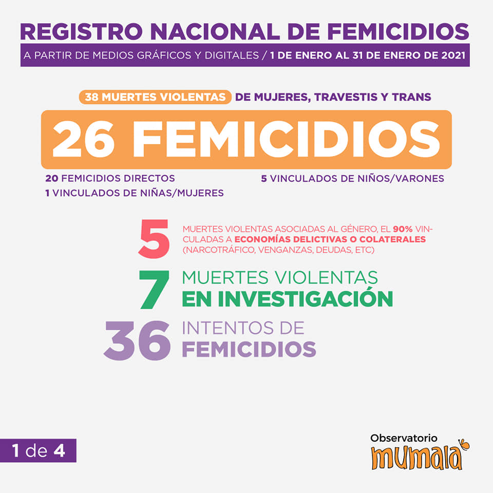 El primer mes de 2021 dejó un saldo de 26 femicidios -6 vinculados- y 36 intentos de femicidio, según los registros de Mumalá.-
